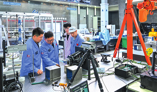 中國科學(xué)院空間光學(xué)系統(tǒng)在軌制造與集成重點實驗室副主任徐振邦(左二)與同事在實驗室內(nèi)討論科研工作(2023年5月25日攝) 許暢攝 / 本刊