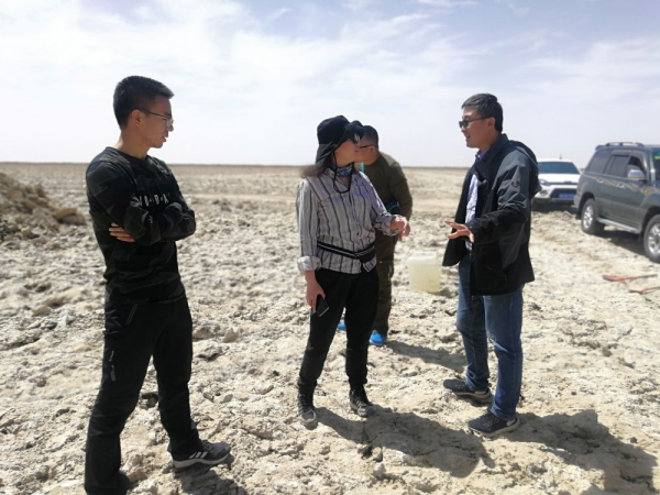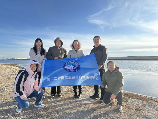 2024年11月25日,王建萍(右三)和科研團(tuán)隊(duì)在鹽湖進(jìn)行野外考察。