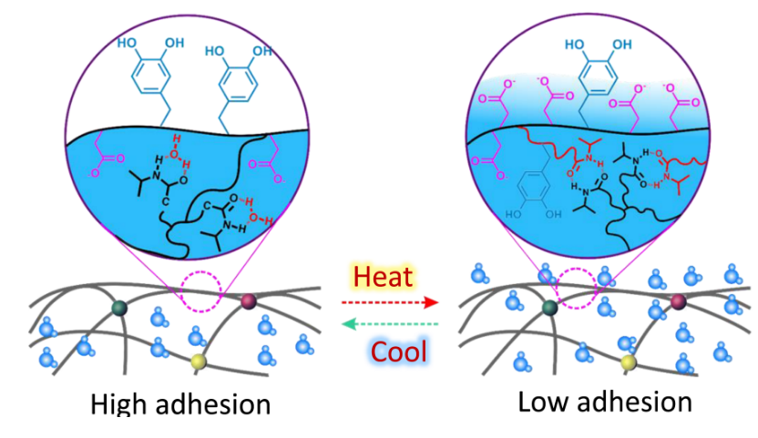 這項突破并非一蹴而就。周峰回憶,幾年前,團隊一直攻關高強韌黏附水凝膠材料,偶然發(fā)現(xiàn)一種材料在多次按壓后黏性驟降?!霸摤F(xiàn)象引發(fā)了我們的極大興趣,經(jīng)過對材料的成分分析、機理驗證等,才知道原來在多次按壓以后,手部溫度傳遞到凝膠表面,致使凝膠發(fā)生相變,呈現(xiàn)低黏附態(tài)?!边@讓團隊意識到,溫度可能是調(diào)控黏附性能的鑰匙。