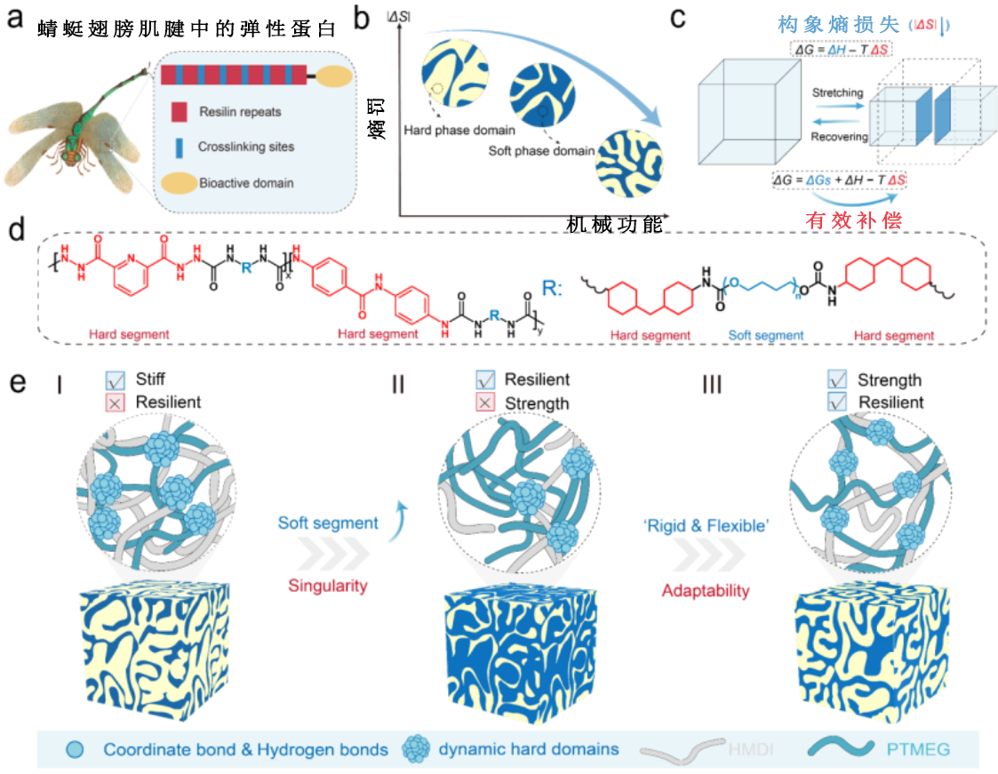 團(tuán)隊(duì)從分子層面動(dòng)手:先在聚氨酯分子里引入動(dòng)態(tài)氫鍵和配位鍵,像在分子內(nèi)部埋了“魔術(shù)拉鏈”,它們既能牢牢固定硬域的形狀,又能在拉伸時(shí)自動(dòng)解鎖。當(dāng)材料受到外力拉伸時(shí),硬域先分解,釋放了分子鏈的“自由度”,熵增加(形變?nèi)菀祝慌c此同時(shí),柔軟的鏈段會(huì)有序結(jié)晶,吸收能量,焓降低(彈性增強(qiáng));這種能量的“此消彼長(zhǎng)”讓材料變得又強(qiáng)又彈,一舉打破了“熵罰”難題。