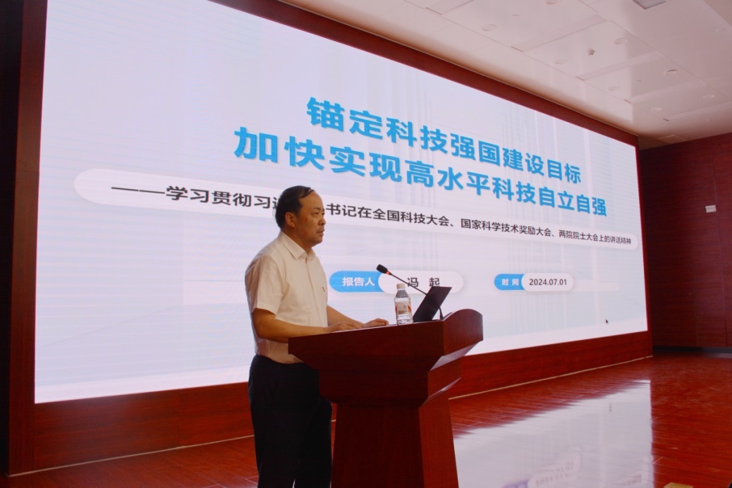 院長(zhǎng)馮起傳達(dá)學(xué)習(xí)了習(xí)近平總書記重要講話精神和全國(guó)科技大會(huì)精神,作了《錨定科技強(qiáng)國(guó)建設(shè)目標(biāo) 加快實(shí)現(xiàn)高水平科技自立自強(qiáng)》專題報(bào)告。他強(qiáng)調(diào),全體黨員干部要牢記國(guó)家戰(zhàn)略科技力量職責(zé)定位,面向國(guó)家重大戰(zhàn)略需求和科技前沿,持續(xù)凝練并推動(dòng)重大科技任務(wù)攻關(guān),自覺把科研追求融入建設(shè)科技強(qiáng)國(guó)的偉大事業(yè)中,將學(xué)習(xí)成果轉(zhuǎn)化為建設(shè)科技強(qiáng)國(guó)的強(qiáng)大動(dòng)力和生動(dòng)實(shí)踐,推動(dòng)各項(xiàng)工作不斷取得新的更大的成績(jī)。
