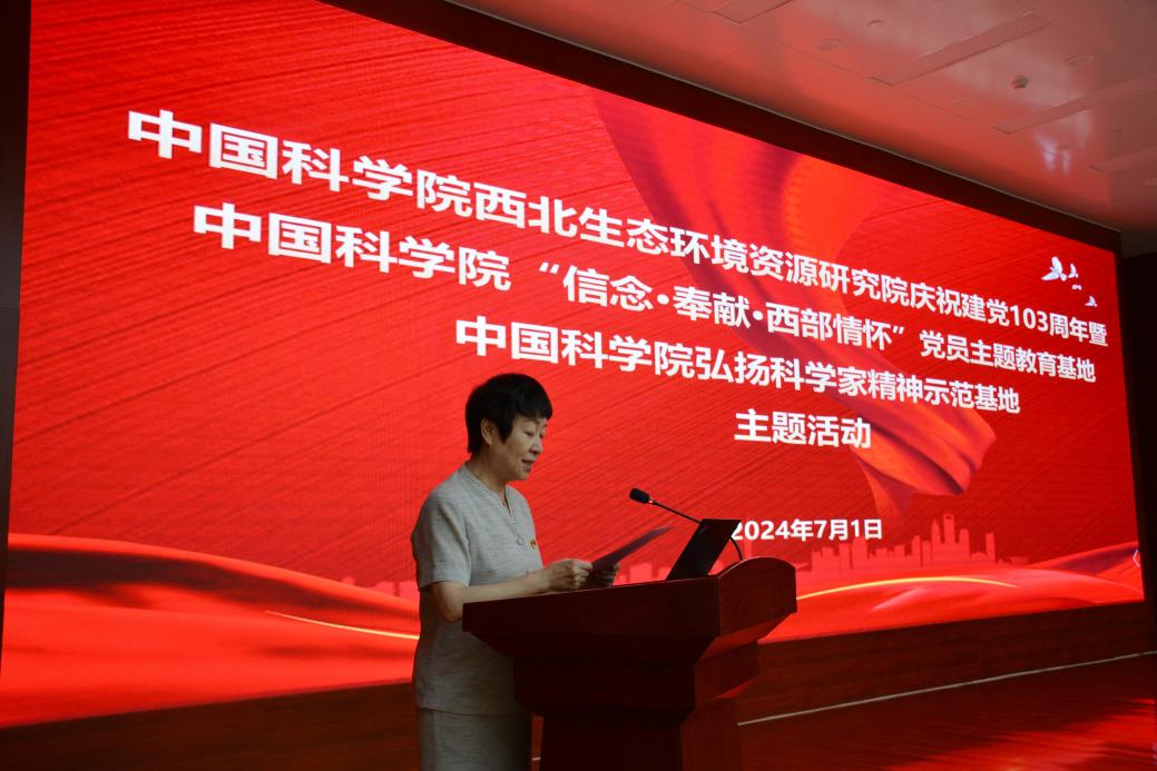 為慶祝中國(guó)共產(chǎn)黨成立103周年,7月1日,中國(guó)科學(xué)院西北生態(tài)環(huán)境資源研究院舉行中國(guó)科學(xué)院“信念·奉獻(xiàn)·西部情懷”黨員主題教育基地、中國(guó)科學(xué)院弘揚(yáng)科學(xué)家精神示范基地主題活動(dòng)。西北研究院黨委委員、領(lǐng)導(dǎo)班子成員、紀(jì)委委員、院務(wù)委員,黨支部書記、支部委員,研究室(中心)、實(shí)驗(yàn)室、野外臺(tái)站和管理部門黨員負(fù)責(zé)人,黨員代表等參加活動(dòng)。黨委副書記、紀(jì)委書記王萍主持活動(dòng)。