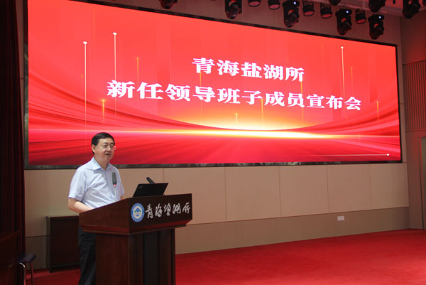 7月5日,中國科學院人事局副局長蔡宏志帶隊宣布中國科學院青海鹽湖研究所新一屆領導班子任命。青海鹽湖所新老領導班子成員、黨委委員、紀委委員、中層正職、黨支部書記及正高級科研人員等40余人參加了宣布會議。蘭州分院副院長、分黨組成員趙培慶出席并主持會議。