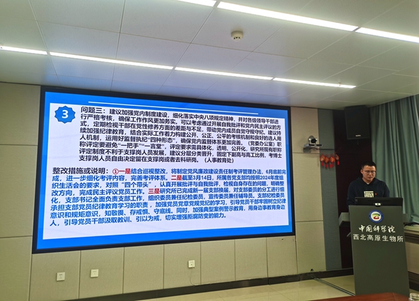 宣傳委員祁振軍向全體黨員通報(bào)了《中共中國(guó)科學(xué)院西北高原生物研究所委員會(huì)2024年度黨員領(lǐng)導(dǎo)干部民主生活會(huì)征求意見(jiàn)整改措施》。