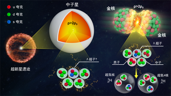 超子是包含有奇異夸克(s)的重子,核子(質(zhì)子和中子的統(tǒng)稱)中只包含有上夸克(u)和下夸克(d)。超子和核子可以形成束縛態(tài),人們稱之為“超核”。理論預(yù)言宇宙中的致密天體——中子星的內(nèi)部存在超子。然而,超子的出現(xiàn)將軟化核物質(zhì)狀態(tài)方程,這給理論上構(gòu)建大質(zhì)量的中子星帶來(lái)了挑戰(zhàn),被稱為中子星研究中的 “超子謎題”。