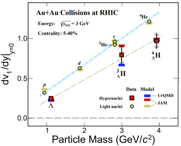 圖2:STAR實(shí)驗(yàn)3GeV金-金碰撞中,中心快度區(qū)直接流斜率(縱軸)與粒子的質(zhì)量(橫軸)之間的關(guān)聯(lián)圖。實(shí)心方框是最新觀測(cè)到超核/超子的結(jié)果,輕核(p、d、t、3He、4He)則用實(shí)心圓圈表示。淺綠色短線和點(diǎn)劃線分別為擬合了超核和輕核直接流斜率與質(zhì)量依賴關(guān)系后的結(jié)果。輸運(yùn)模型結(jié)合并和過(guò)程,可以定性描述實(shí)驗(yàn)結(jié)果。(圖源/Physical Review Letters)