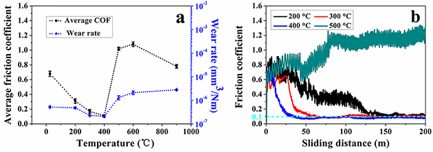圖2 (Hf-Mo-Nb-Ta-Ti)C高熵陶瓷在真空環(huán)境下的高溫摩擦學(xué)性能
