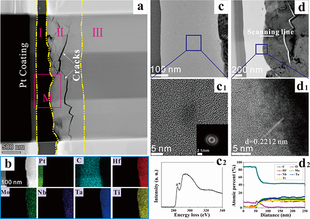 圖3 高熵陶瓷試樣在真空400 oC時磨痕的TEM分析
