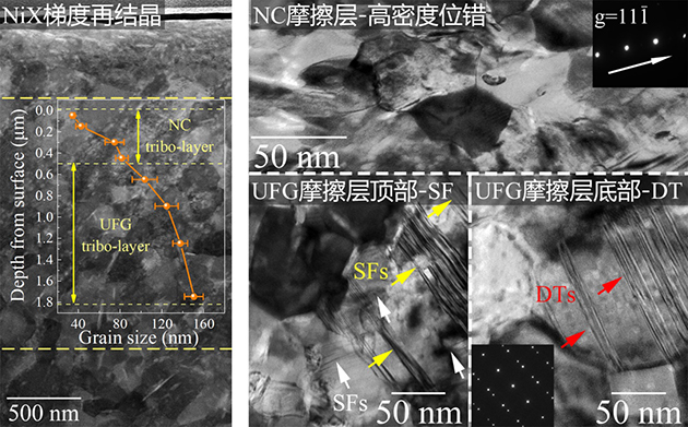 圖2.Ni50(AlNbTiV)50合金在室溫摩擦過程中形成納米晶/超細晶梯度耐磨層