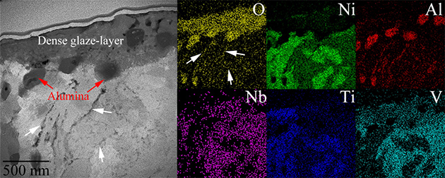 圖3.Ni50(AlNbTiV)50合金在800℃摩擦過程中形成耐磨損釉質(zhì)層