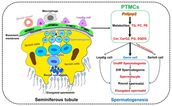 研究模式圖:胰脂肪酶相關(guān)蛋白2基因(Pnliprp2)在小鼠睪丸管周肌樣細(xì)胞中特異表達(dá),并在維持精子發(fā)生中發(fā)揮關(guān)鍵作用