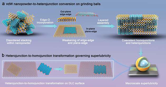 研究人員開發(fā)了一種通過摻入石墨烯邊緣氧削弱納米粉體邊緣釘扎效應(yīng)的簡(jiǎn)易方法,實(shí)現(xiàn)了二維納米粉體到異質(zhì)結(jié)轉(zhuǎn)化,制備了由大量納米尺度同質(zhì)結(jié)和異質(zhì)結(jié)共存的材料,實(shí)現(xiàn)了載荷、速度等可調(diào)、寬溫域(-200~300°C)和宏觀尺度結(jié)構(gòu)超潤(rùn)滑,揭示了異質(zhì)滑移和同質(zhì)鎖定的超滑調(diào)控機(jī)制。該研究結(jié)果對(duì)結(jié)構(gòu)超潤(rùn)滑的規(guī)模放大和工程應(yīng)用具有重要意義。