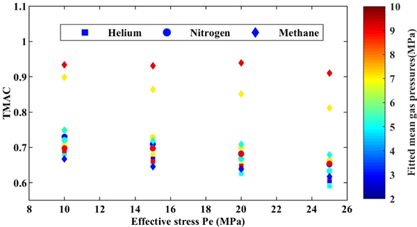 圖2 甲烷吸附導(dǎo)致甲烷切向動量轉(zhuǎn)換系數(shù)(TMAC)明顯大于氦氣和氮氣