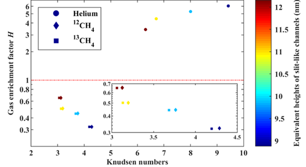 圖3 甲烷-氦氣混合體系中各組分的克努森數(shù)差異導(dǎo)致氣體富集系數(shù)有顯著差異