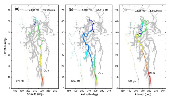 (a) DL-1沿著第一個(gè)梯級(jí)先導(dǎo)形成的回?fù)敉ǖ腊l(fā)展 (b - c)DL-2和DL-3沿著第二個(gè)梯級(jí)先導(dǎo)形成的回?fù)敉ǖ腊l(fā)展