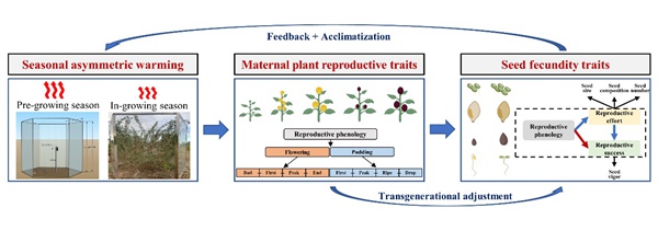 基于此,中國(guó)科學(xué)院西北生態(tài)環(huán)境資源研究院(以下簡(jiǎn)稱西北研究院)科研人員以科爾沁沙地優(yōu)勢(shì)固沙灌木小葉錦雞兒(Caragana microphylla)為研究對(duì)象,探究了不同時(shí)段增溫對(duì)其繁殖物候和種子繁殖力的影響及差異,并從繁殖努力和繁殖成功角度分析了種子繁殖應(yīng)對(duì)季節(jié)非對(duì)稱性增溫的響應(yīng)策略(圖1)。研究發(fā)現(xiàn),繁殖物候通過(guò)提前開(kāi)始、推遲結(jié)束、延長(zhǎng)持續(xù)期和降低同步性來(lái)適應(yīng)季節(jié)非對(duì)稱性增溫(圖2),同時(shí)這種適應(yīng)分別增加和阻礙了種子的繁殖努力和成功(圖4)。繁殖物候適應(yīng)性、種子繁殖努力和成功與生長(zhǎng)季溫度和增溫時(shí)長(zhǎng)呈正相關(guān),而生長(zhǎng)季前增溫對(duì)繁殖努力和成功均有負(fù)面影響(圖3-4)。該研究結(jié)果表明,增溫的季節(jié)非對(duì)稱性和持續(xù)時(shí)間,可通過(guò)調(diào)整繁殖物候模式和種子繁殖性狀來(lái)改變種子繁殖策略,其中生長(zhǎng)季前較暖的冬季和春季降低了半干旱沙區(qū)固沙灌木小葉錦雞兒種子的繁殖力。