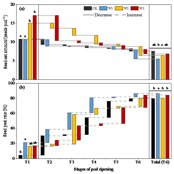 圖3 不同增溫處理下果熟期不同階段小葉錦雞兒(a)結(jié)種量和(b)蟲(chóng)害率