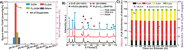 圖2.(A)篩選Ni基催化劑;(B)不同反應(yīng)時間下的XRD結(jié)果; (C)穩(wěn)定性測試
