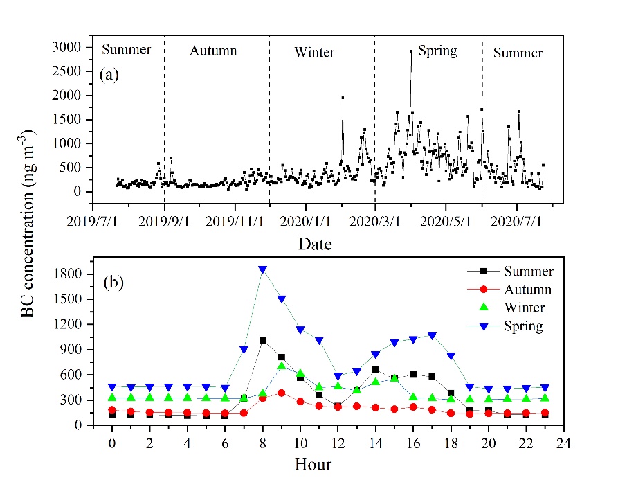 圖1 研究區(qū)黑碳?xì)馊苣z的季節(jié)和日變化特征