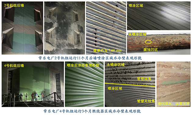 中國(guó)科學(xué)院蘭州化學(xué)物理研究所低碳能源材料組高祥虎研究員團(tuán)隊(duì)近年來圍繞電站關(guān)鍵材料,專注于大型電站鍋爐輻射受熱面防護(hù)與節(jié)能增效關(guān)鍵技術(shù)研究。團(tuán)隊(duì)研發(fā)的納米高熵防護(hù)與節(jié)能增效陶瓷涂層,突破了陶瓷材料防結(jié)焦、耐高溫腐蝕、紅外增效、高導(dǎo)熱率、熱膨脹系數(shù)可調(diào)等關(guān)鍵技術(shù),同時(shí)具有降低煤耗、提高煤種適應(yīng)性的多功能特點(diǎn),可滿足大型調(diào)峰電站及其他常規(guī)電站的使用需求。在常樂電廠的大力支持下,該材料先后在其2號(hào)、4號(hào)機(jī)組開展應(yīng)用。在爐膛服役1年后,使用了涂層材料的水冷壁管壁表面光滑致密、無結(jié)焦、附著物易清除、未出現(xiàn)凹坑和管壁減薄等腐蝕情況,表現(xiàn)出優(yōu)異的耐高溫腐蝕和防結(jié)焦性能。經(jīng)西安熱工研究院有限公司現(xiàn)場(chǎng)檢測(cè),管壁厚度較噴涂前無明顯變化。對(duì)照相同區(qū)域未噴涂防護(hù)涂層的水冷壁表面均出現(xiàn)明顯的腐蝕凹坑,并附著有褐色的腐蝕產(chǎn)物。