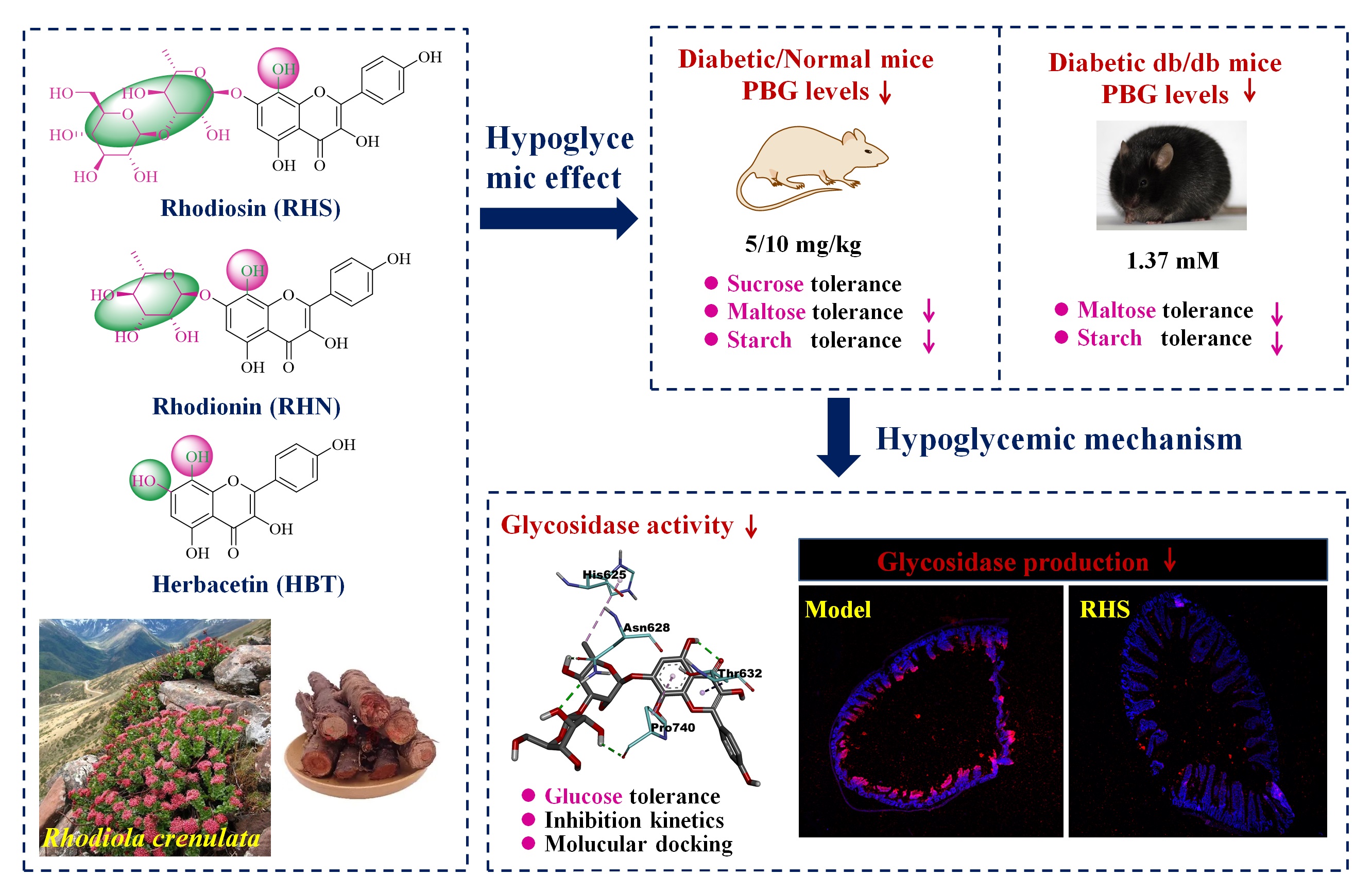 中國科學(xué)院西北高原生物研究所藏藥研究重點實驗室研究發(fā)現(xiàn)8-羥基黃酮類化合物RHS(5 mg/kg和10 mg/kg)能有效降低正常和糖尿病小鼠PBG水平。同時發(fā)現(xiàn),RHS、RHN和HBT在轉(zhuǎn)基因糖尿病小鼠中均具有顯著的PBG降低作用,其作用與阿卡波糖相當(dāng)或強于阿卡波糖。值得注意的是,研究首次發(fā)現(xiàn)RHS不僅能夠抑制糖苷酶的活性,而且能夠顯著抑制該酶在小腸的表達(dá),從而高效的降低PBG。而糖苷酶合成或者表達(dá)的抑制可能作為降糖藥物或者糖脂代謝調(diào)節(jié)藥物研發(fā)的新靶點。