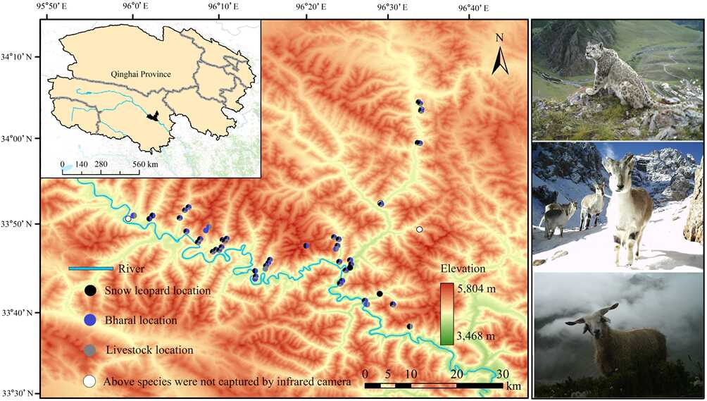 中國科學院西北高原生物研究所動物生態(tài)與資源保護研究團隊以人獸沖突較為嚴重的曲麻萊縣巴干鄉(xiāng)為研究地區(qū),利用調查問卷評估了當地牧民對雪豹襲擊家畜事件的態(tài)度,并結合紅外相機陷阱技術獲得了雪豹和其主要獵物巖羊(Pseudois nayaur)以及散養(yǎng)家畜的影像資料,進而探討了三種(類)動物的時空重疊。研究結果表明: (1)雪豹主要在夜間捕食家畜,牧民因雪豹襲擊家畜事件的發(fā)生而對雪豹保護持消極態(tài)度;(2)巖羊和家畜的空間利用重疊度最高(OI = 0.78),其次是雪豹和巖羊(OI?。健?.75)以及雪豹和家畜(OI = 0.75);(3)雪豹屬于典型的夜行性動物,而巖羊和家畜以晝間活動為主。巖羊和家畜的日活動節(jié)律模式高度一致,時間重疊指數最高(D?。健?.95),而雪豹和巖羊、雪豹和家畜的日活動節(jié)律重疊指數較低(D?。健?.51),且重疊時段主要集中于夜間。綜上所述,由于雪豹、巖羊和散養(yǎng)家畜之間存在較高的空間重疊,可能增加了家畜被雪豹捕食的機會,同時,家畜和巖羊活動節(jié)律的高度重疊進一步加劇了此類事件的發(fā)生幾率?;谘芯拷Y果,我們提出了針對性的保護和管理措施,例如規(guī)范放牧區(qū)域以減小家畜與雪豹的相遇幾率,加強對散養(yǎng)家畜的夜間管理以減少雪豹夜間肇事等。