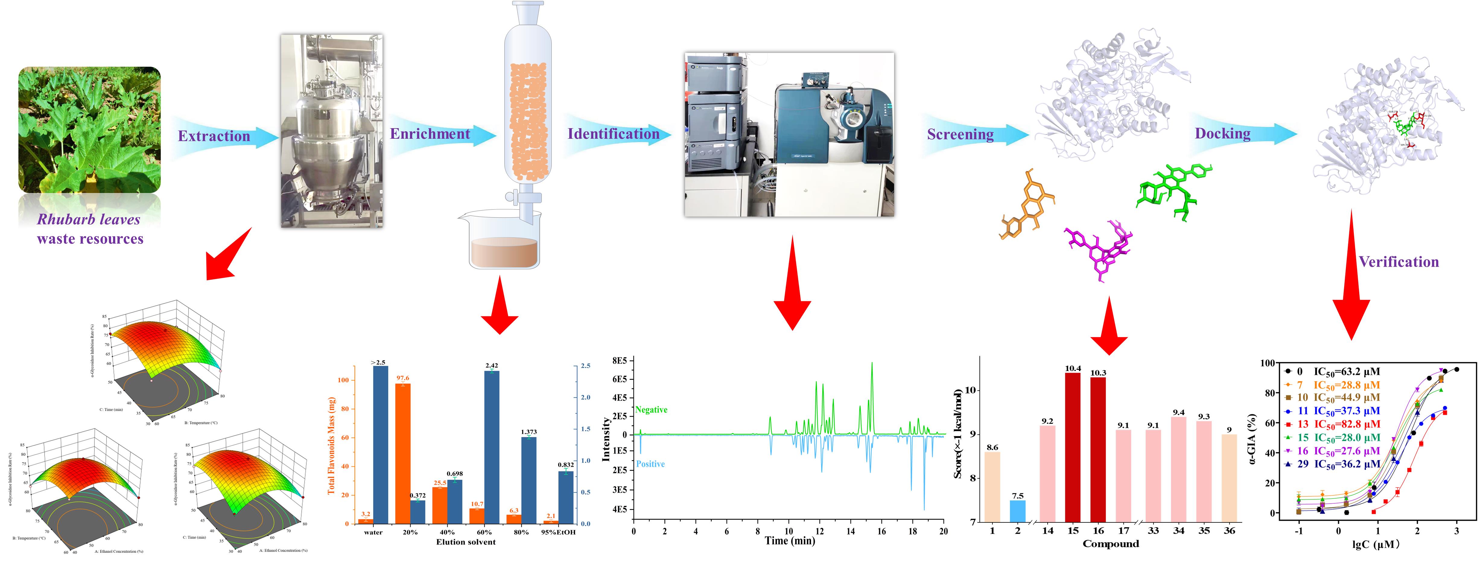 中國科學(xué)院西北高原生物研究所高原藏藥資源質(zhì)控與藥理毒理評價研究團(tuán)隊(duì)以α-葡萄糖苷酶抑制活性作為關(guān)鍵評價指標(biāo),建立了基于大孔吸附樹脂富集、UPLC-QTOF-MS/MS分析表征、分子對接、體外驗(yàn)證的唐古特大黃葉中α-葡萄糖苷酶抑制劑的系統(tǒng)篩選策略,篩選得到myricitrin、rumarin等6個α-葡萄糖苷酶抑制劑。基于穩(wěn)態(tài)、同步、三維熒光光譜和遠(yuǎn)紫外圓二色譜等多光譜技術(shù)的對接機(jī)制研究表明,6個抑制劑均能與α-葡萄糖苷酶發(fā)生結(jié)合并改變靶蛋白的酪氨酸和色氨酸殘基微環(huán)境,通過降低靶蛋白α-螺旋或β-轉(zhuǎn)角等二級結(jié)構(gòu)的含量從而導(dǎo)致蛋白酶失活,該研究為唐古特大黃廢棄資源的利用提供了新的見解。
