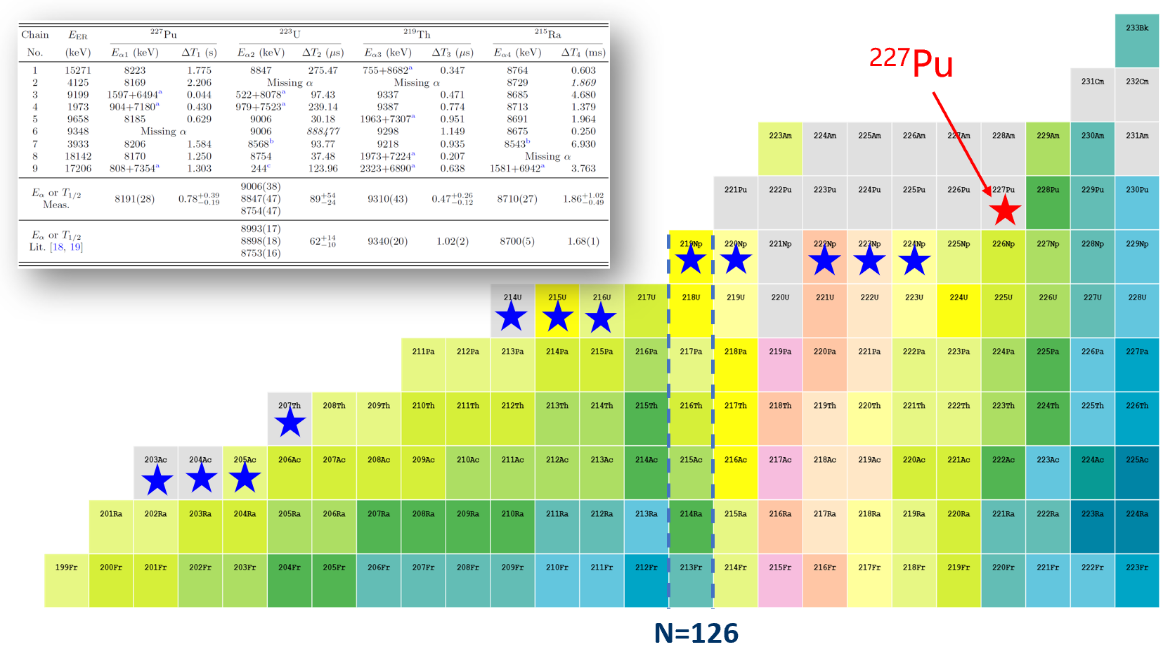 圖:實(shí)驗(yàn)觀測(cè)到的9個(gè)新核素钚-227的α衰變事件以及钚-227在核素圖上的位置(紅色五星)。藍(lán)色五星標(biāo)記的是近代物理所團(tuán)隊(duì)此前合成的部分新核素。(圖/楊華彬)