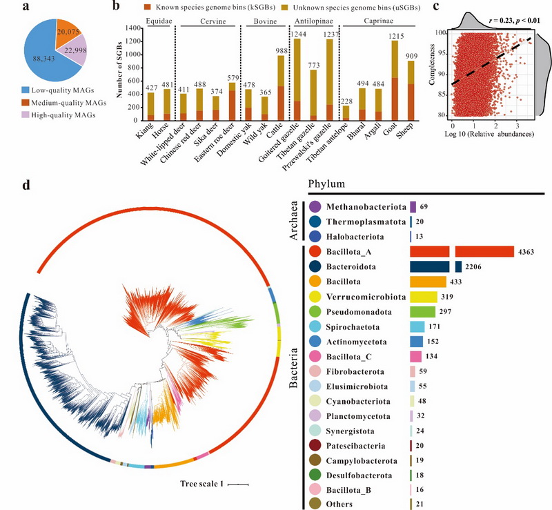 中國科學(xué)院西北高原生物研究所動物生態(tài)與資源保護(hù)研究團(tuán)隊以中國境內(nèi)奇蹄目(Perissodactyla)和鯨偶蹄目(Cetartiodactyla)17個常見有蹄類物種為研究對象,通過大規(guī)模宏基因組測序和組裝、分箱和注釋,獲得131,416個宏基因組組裝基因組(MAGs),其中包含22,998個高質(zhì)量MAGs和11,175個菌種水平基因組(SGBs),成功構(gòu)建了中國典型有蹄類物種的腸道微生物宏基因組圖譜,其中60%左右的SGBs為本研究首次報道。