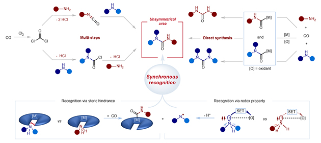 如何基于不同胺物理化學性質(zhì)的細微差異,讓兩種不同胺片段找準位置,連接在同一羰基位點,一步合成非對稱脲是一個挑戰(zhàn)性難題。中國科學院蘭州化學物理研究所低碳催化與二氧化碳利用重點實驗室何林研究員團隊與武漢大學雷愛文教授團隊合作,提出了同步胺識別的概念,在鈷催化中心,當一級胺與二級胺共存時,僅有一級胺發(fā)生羰化生成?;锓N,表現(xiàn)出鈷物種對一級胺的選擇性識別;在銅催化中心,一級胺與二級胺與銅相互作用過程中,二級胺能夠快速生成自由基物種,表現(xiàn)出銅物種對二級胺的傾向性識別。首創(chuàng)性利用上述識別效應,在胺氧化羰基化一個催化反應中融合親核羰基化半反應與自由基生成轉(zhuǎn)化半反應全新反應機制,獲得了一步合成非對稱脲的獨特反應窗口。