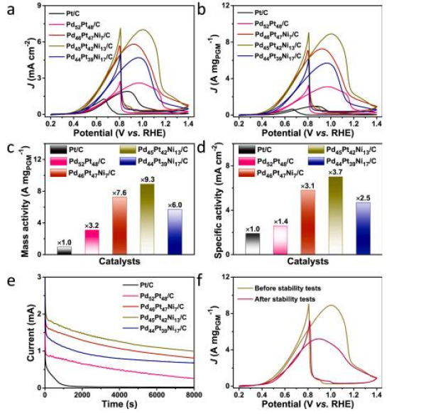 多孔PdPtNi納米片和商業(yè)Pt/C在含0.5 M乙醇的0.1 M KOH電解質(zhì)中的EOR電催化性能
