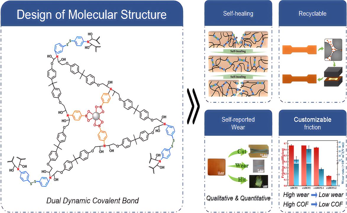 近日,研究人員通過動(dòng)態(tài)可逆的分子結(jié)構(gòu)設(shè)計(jì),實(shí)現(xiàn)了一種具有自愈合、可回收、自報(bào)告磨損和可定制摩擦的多功能熱固性環(huán)氧樹脂?;趧?dòng)態(tài)共價(jià)鍵的可逆交換,環(huán)氧玻璃體可通過熱壓實(shí)現(xiàn)回收和損傷修復(fù),而無需額外的粘合劑或催化劑。此外,利用動(dòng)態(tài)共價(jià)鍵的可逆性,將具有特定摩擦學(xué)特性的納米填料(氧化石墨烯和聚四氟乙烯)納入回收過程,以實(shí)現(xiàn)可定制的摩擦系數(shù)和耐磨損性能。不僅如此,研究人員利用二硫鍵的動(dòng)態(tài)性質(zhì),實(shí)現(xiàn)了基于硫自由基的磨損自報(bào)告特性,還研究了磨損時(shí)間與磨損狀態(tài)之間的關(guān)系。