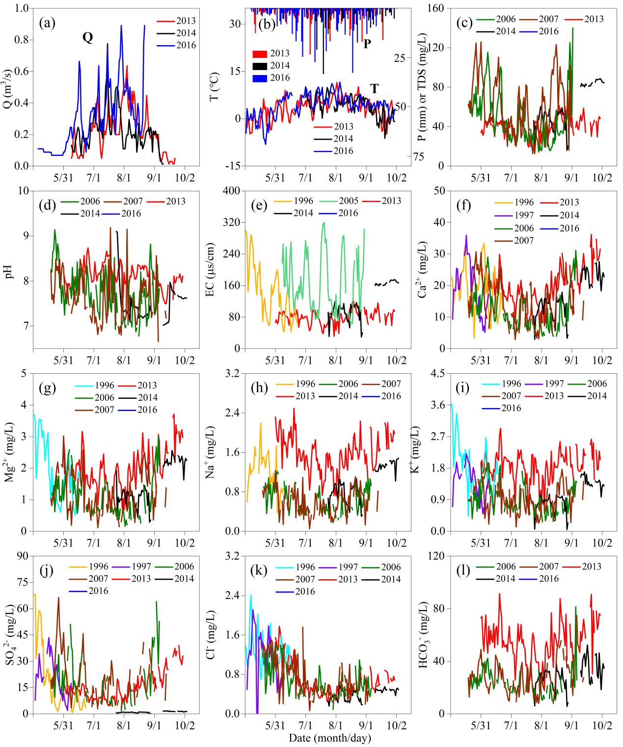 圖1. 烏魯木齊1號冰川流量、氣溫、降水、TDS、EC、pH和主離子的年際及年內變化特征