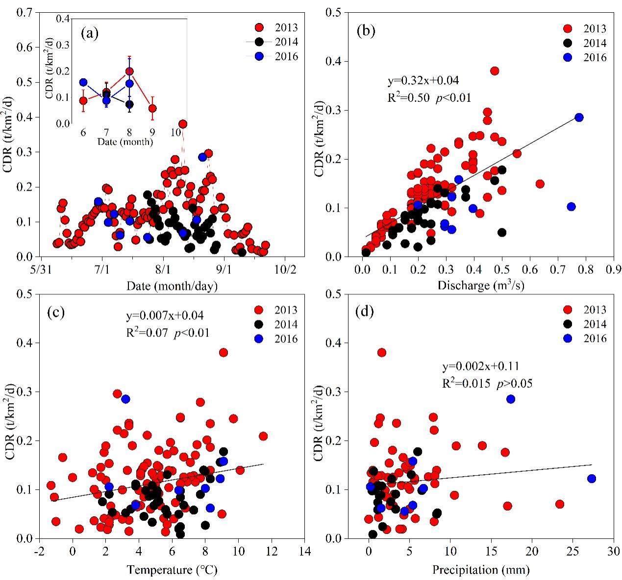 圖2. 2013、2014和2016年烏魯木齊1號冰川流域陽離子剝蝕率(CDR)日、月變化(a)及其與