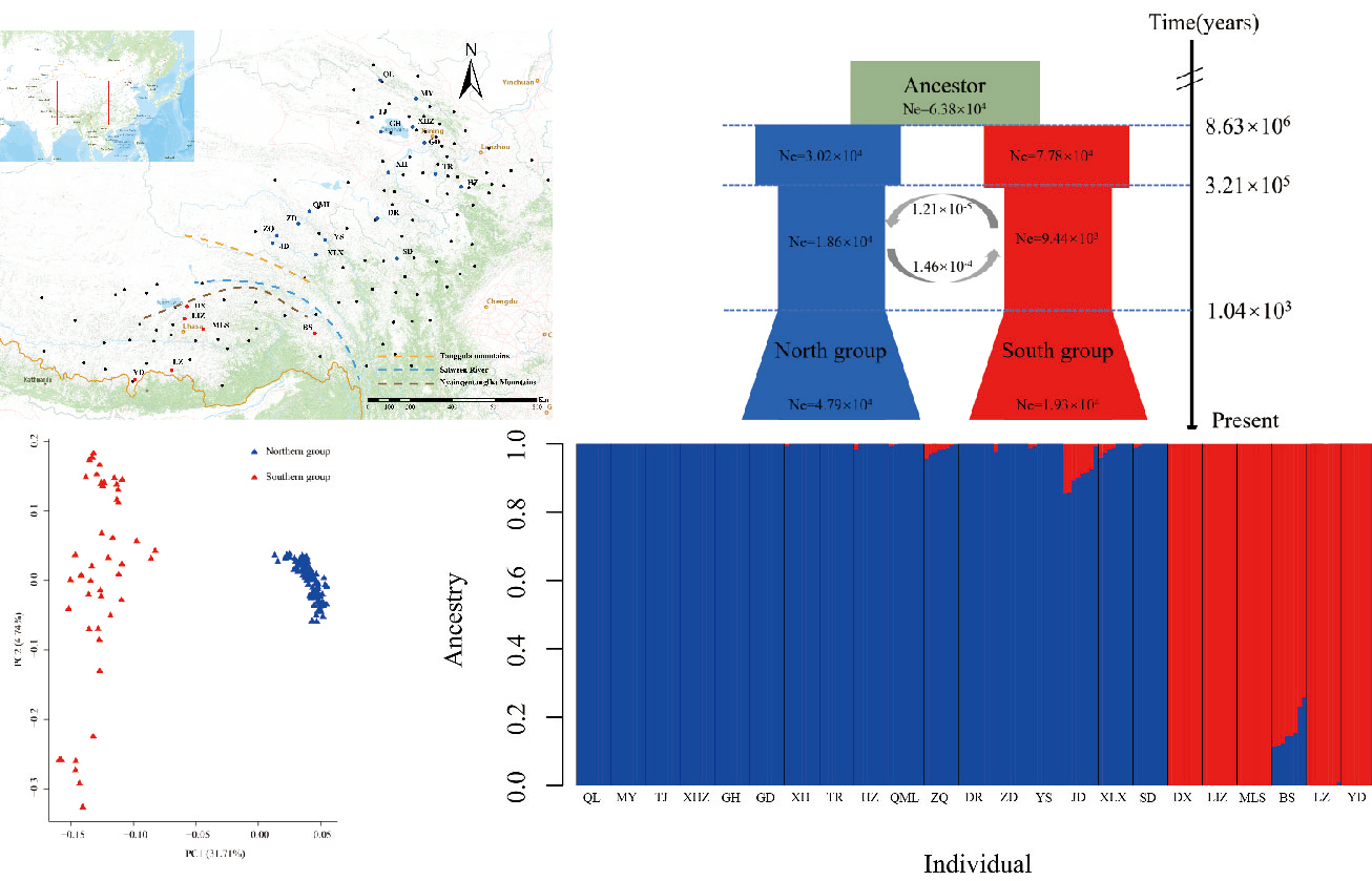中國(guó)科學(xué)院西北高原生物研究所青藏高原植物適應(yīng)與進(jìn)化研究團(tuán)隊(duì)利用簡(jiǎn)化基因組測(cè)序技術(shù),對(duì)覆蓋青藏高原地區(qū)的23個(gè)居群183份肉果草樣本進(jìn)行測(cè)序分析。結(jié)果顯示肉果草分為北部和南部?jī)蓚€(gè)群體,其分界線與唐古拉山、念青唐古拉山及怒江的地理屏障高度吻合。群體歷史模擬表明,約30萬(wàn)年前該物種經(jīng)歷了種群瓶頸事件,此后南北群體間出現(xiàn)持續(xù)基因流,且有效種群大小呈現(xiàn)緩慢增長(zhǎng)趨勢(shì)。物種分布模型分析結(jié)果表明,海拔是影響肉果草分布的主導(dǎo)因素,其次為降水量和溫度。未來(lái)氣候變暖情景下,其適宜生境預(yù)計(jì)縮減40%-60%,并向高海拔區(qū)域遷移。當(dāng)前,過(guò)度采挖與生境破碎化嚴(yán)重威脅肉果草生存,亟需優(yōu)先保護(hù)高遺傳多樣性核心種群,并推動(dòng)規(guī)范化人工栽培以保障資源可持續(xù)利用。