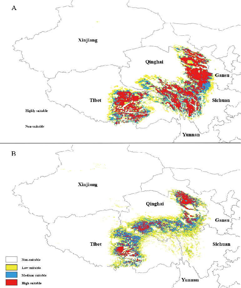 當(dāng)前(A)和未來(lái)全球變暖(B)情景下肉果草的潛在分布情況