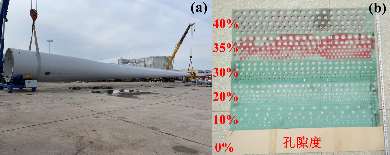 退役或損壞風(fēng)力發(fā)電機葉片(a)和不同孔隙度新型多孔沙障(b)