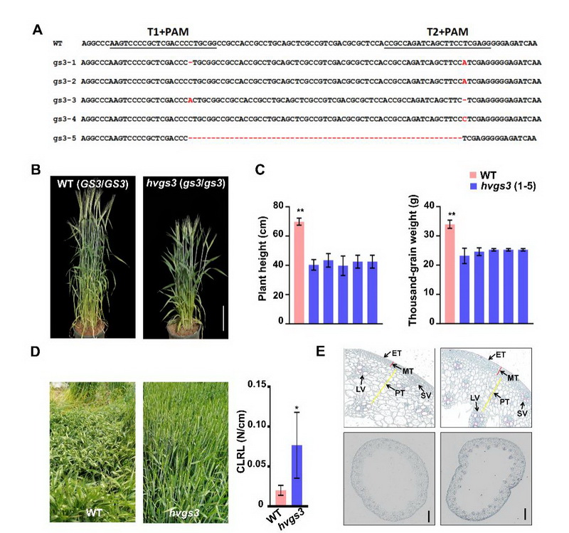 Gγ亞基在多種生物過程中發(fā)揮著重要作用,但其在大麥中的具體功能尚未完全明確。為了深入研究這一問題,中國科學院西北高原生物研究所高原作物種質資源創(chuàng)新與利用研究團隊利用CRISPR/Cas9技術敲除大麥品種Golden Promise中的HvGS3基因,并通過詳細的表型分析比較了突變體hvgs3與野生型之間的株高、穗長和千粒重等農藝性狀。結果顯示,突變體hvgs3的株高比野生型降低了37.8%至43.1%,同時倒二節(jié)的抗倒伏指數(shù)提高了76.6%。進一步分析發(fā)現(xiàn),突變體hvgs3的莖節(jié)細胞長度顯著縮短,導致株高降低。突變體hvgs3的木質素合成通路被激活,木質素含量比野生型增加了22%,基部第二節(jié)間的維管束數(shù)量、機械組織厚度均高于野生型,從而增強了莖稈的機械強度。通過CRISPR/Cas9技術成功敲除HvGS3基因,我們創(chuàng)制了一種具有矮化和抗倒伏特性的大麥新種質資源,株高的降低和莖稈強度的增加共同提升了其抗倒伏性能。該研究不僅揭示了大麥HvGS3基因的功能,還為培育抗倒伏、高產的大麥品種提供了寶貴的理論依據(jù)和技術支持。