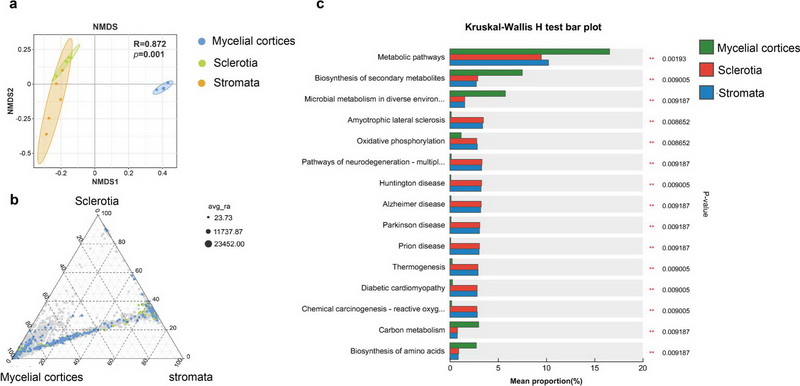 中國科學院西北高原生物研究所青藏高原植物適應與進化研究團隊研究鑒定出4,561個細菌OTU,其中2980個為稀有類群(相對豐度<0.01%)。宏基因組分析顯示,外部菌絲皮層富集576個代謝通路(如碳代謝、次級代謝產(chǎn)物合成),顯著高于菌核(117個)和子座(0個)。稀有類群雖豐度低,但貢獻了關鍵物質循環(huán)基因(如氮代謝基因narG、nosZ),提示其具有“功能庫”作用。共現(xiàn)網(wǎng)絡分析揭示,外部菌絲皮層微生物呈現(xiàn)獨特的模塊化結構,Proteobacteria和Bacteroidetes形成高連接度核心網(wǎng)絡。該區(qū)域特異性富集Caballeronia、Dyella等具有降解功能的細菌屬,可能在昆蟲幼蟲分解和宿主防御中發(fā)揮屏障作用。通過優(yōu)化培養(yǎng)組培養(yǎng)體系,成功分離52株細菌(覆蓋26屬40種),包括8個高通量測序未檢出的菌株(如Plantibacter、Tardiphaga)。81.2 %的目級類群實現(xiàn)可培養(yǎng),為后續(xù)功能驗證和資源利用奠定基礎。