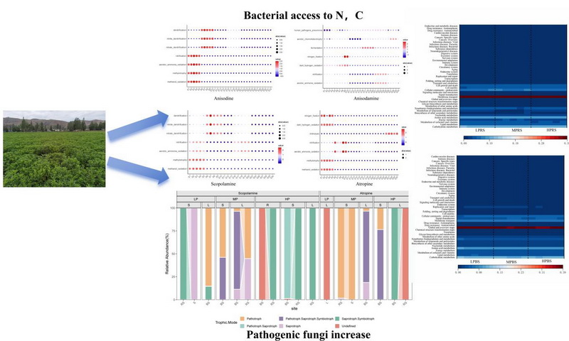中國科學(xué)院西北高原生物研究所高原藥用資源生態(tài)保護(hù)與繁育研究團(tuán)隊(duì)以山莨菪為研究對象,基于微生物組和不同磷肥添加水平下生物堿含量的靶向測定,分析了磷肥添加對山莨菪生物堿含量的影響,揭示了土壤-微生物-植物相互作用的新機(jī)制。研究表明:磷肥通過雙重途徑對生物堿含量產(chǎn)生影響。一方面,土壤氮磷比例失調(diào)打破了土壤微生物氮循環(huán)的平衡,促使更多的細(xì)菌通過硝化-反硝化等過程獲得氮源和碳源,體現(xiàn)了磷肥添加下生物堿合成所需的氮源和能量的缺乏,干擾了植物次生代謝的資源分配;另一方面,磷肥添加重構(gòu)了微生物群落的功能布局,表現(xiàn)為低磷環(huán)境下菌根共生系統(tǒng)對碳、氮、磷的協(xié)同代謝增強(qiáng),而高磷環(huán)境下病原真菌大量繁殖阻礙了生物堿在植物體內(nèi)的合成和積累。這種微生物功能群落的生態(tài)位分化表明土壤養(yǎng)分?jǐn)_動(dòng)會(huì)改變微生物代謝網(wǎng)絡(luò),進(jìn)而調(diào)控藥用植物的次生代謝,為分析人工栽培中土壤管理、微生物功能和藥材質(zhì)量之間的耦合關(guān)系提供了理論依據(jù),明確了養(yǎng)分-微生物-代謝的級聯(lián)調(diào)控效應(yīng),為山莨菪的高效利用和價(jià)值提升提供了新見解。未來的研究應(yīng)重點(diǎn)關(guān)注基于微生物功能調(diào)控的精準(zhǔn)施肥策略,以實(shí)現(xiàn)藥用植物栽培中產(chǎn)量和品質(zhì)的協(xié)同提升。