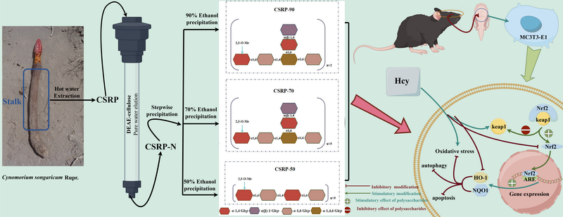 為了解決鎖陽(yáng)資源利用中存在的上述科學(xué)問(wèn)題,中國(guó)科學(xué)院西北高原生物研究所青海省藏藥藥理學(xué)和安全性評(píng)價(jià)研究重點(diǎn)實(shí)驗(yàn)室團(tuán)隊(duì),采用熱水提取、乙醇沉淀分級(jí)及柱層析純化相結(jié)合的方法,從鎖陽(yáng)中得到3個(gè)多糖組分:CSRP-50、CSRP-70和CSRP-90,隨后對(duì)其組成、結(jié)構(gòu)、Hcy誘導(dǎo)成骨細(xì)胞氧化損傷保護(hù)作用進(jìn)行研究。組成結(jié)構(gòu)研究結(jié)果表明,3個(gè)多糖組分均為天然甲基化的α-(1→4),(1→6)-D-葡聚糖,其主鏈由α-1,4-D-Glcp和α-1,6-D-Glcp交替構(gòu)成。其中,CSRP-50無(wú)支鏈結(jié)構(gòu),CSRP-70和CSRP-90存在由α-1,6-D-Glcp和末端1位連接的α(β)-D-Glcp構(gòu)成的支鏈,該支鏈結(jié)構(gòu)連接在主鏈α-1,4-D-Glcp的O-6位。藥理活性研究結(jié)果表明,CSRP-50、CSRP-70和CSRP-90均可通過(guò)激活Keap1/Nrf2信號(hào)通路,增強(qiáng)成骨細(xì)胞抗氧化能力,進(jìn)而保護(hù)成骨細(xì)胞對(duì)抗Hcy誘導(dǎo)的氧化應(yīng)激損傷,表現(xiàn)出很好的抗骨質(zhì)疏松作用潛力。該研究為鎖陽(yáng)及其多糖成分在抗骨質(zhì)疏松癥方面的進(jìn)一步研究與利用提供科學(xué)依據(jù)。