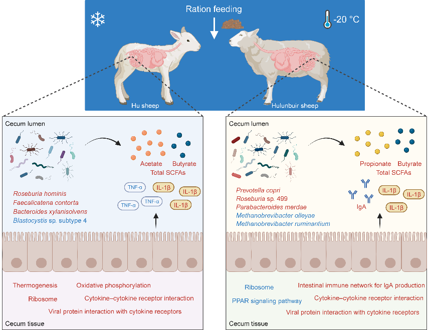 近期,中國科學(xué)院西北生態(tài)環(huán)境資源研究院畜牧團(tuán)隊(duì)聯(lián)合山東省農(nóng)業(yè)科學(xué)院、黃三角生物遺傳與分子精準(zhǔn)育種實(shí)驗(yàn)室和黃河口生物精準(zhǔn)營養(yǎng)研發(fā)中心,以呼倫貝爾羊(耐寒型)與湖羊(低溫敏感型)為研究對象,通過構(gòu)建綿羊冷慢性應(yīng)激模型,結(jié)合限飼控制,系統(tǒng)解析了盲腸微生物群落、代謝產(chǎn)物及宿主轉(zhuǎn)錄組的協(xié)同響應(yīng)機(jī)制。