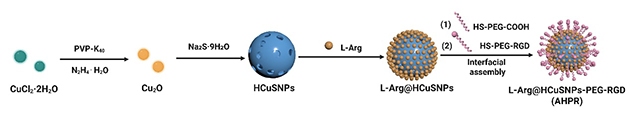 近日,中國科學(xué)院蘭州化學(xué)物理研究所天然藥物與化學(xué)測量研究中心海軍人才團(tuán)隊(duì)與新疆大學(xué)合作,針對(duì)傳統(tǒng)抗腫瘤藥物遞送系統(tǒng)的局限性,發(fā)展了一種“高效靶向+刺激響應(yīng)+光熱協(xié)同”智能響應(yīng)抗腫瘤藥物遞送材料。研究人員通過將一氧化氮供體L-精氨酸(L-Arg)負(fù)載到具有近紅外吸收的中空硫化銅納米顆粒(HCuSNPs)中,并與腫瘤靶向肽(RGD)組裝,合成AHPR智能納米遞送材料。體外和體內(nèi)實(shí)驗(yàn)表明,近紅外光激發(fā)下AHPR產(chǎn)生熱效應(yīng),誘導(dǎo)納米結(jié)構(gòu)降解并釋放銅離子和一氧化氮,提高血管通透性,促進(jìn)藥物深度滲透。同時(shí),協(xié)同觸發(fā)光熱治療、銅死亡及活性氧/活性氮風(fēng)暴,實(shí)現(xiàn)高效抗腫瘤效果(體積減少90%)。