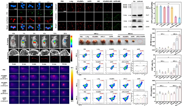 研究人員進(jìn)一步利用熒光-光聲成像可視化技術(shù),揭示了智能響應(yīng)抗腫瘤藥物遞送體系的作用機(jī)制。結(jié)果表明,AHPR組裝腫瘤靶向肽,可主動(dòng)識(shí)別并富集于腫瘤部位,實(shí)現(xiàn)高效靶向遞送。并在近紅外光激發(fā)下,通過溫和光熱、銅死亡和ONOO?產(chǎn)生等機(jī)制調(diào)控腫瘤免疫微環(huán)境,促進(jìn)DCs成熟,增強(qiáng)T細(xì)胞的浸潤和巨噬細(xì)胞極化,誘導(dǎo)免疫原性細(xì)胞死亡,將“冷”腫瘤轉(zhuǎn)化為“熱”腫瘤。值得注意的是,AHPR可與免疫檢查點(diǎn)抑制劑(αPD-L1) 結(jié)合,進(jìn)一步增強(qiáng)免疫應(yīng)答率,改善腫瘤治療效果。這一策略為抗腫瘤藥物智能遞送材料開發(fā)和多維腫瘤免疫治療提供了新思路。