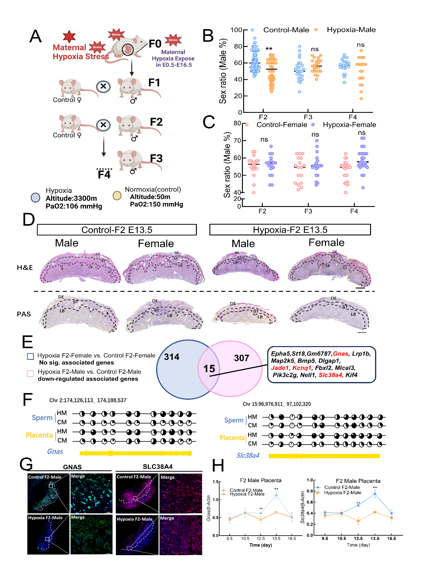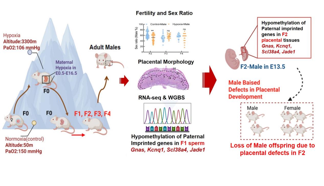 為探究母體低氧環(huán)境暴露對子代的跨代影響,中國科學(xué)院西北高原生物研究所動物生態(tài)與資源保護(hù)研究團(tuán)隊(duì)建立了孕期低氧暴露小鼠模型,將經(jīng)歷過孕期低氧暴露的小鼠(F0)轉(zhuǎn)運(yùn)至低海拔后,出生的雄性小鼠和對照雌鼠合籠,連續(xù)飼養(yǎng)四代(F1-F4)。從2018年 9月到 2023年 8月,通過大量出生性別統(tǒng)計(jì)和不同發(fā)育階段的性別鑒定,發(fā)現(xiàn)母體孕期低氧暴露會造成F2代雄性個體顯著減少。進(jìn)一步的分析發(fā)現(xiàn)F2雄性減少是由于在胚胎期13.5天發(fā)生的胚胎特異性丟失。雄性胚胎丟失的主要原因?yàn)樘ケP形態(tài)和功能異常。研究團(tuán)隊(duì)通過胎盤轉(zhuǎn)錄組和全基因組DNA甲基化測序聯(lián)合分析,發(fā)現(xiàn)父源印記基因Slc38a4,Gnas,Jade1 和Kcnq1表達(dá)異常。隨后,通過對F1代小鼠成熟精子與F2代雄性胎盤全基因組DNA甲基化進(jìn)行聯(lián)合分析,結(jié)果發(fā)現(xiàn)以上印記基因DNA甲基化模式高度相似。這說明經(jīng)歷胚胎期低氧的F1代雄性小鼠的精子存在甲基化異常,并且可以進(jìn)一步影響F2雄性個體生長發(fā)育進(jìn)而導(dǎo)致性別比例異常。該工作系統(tǒng)地揭示母體低氧暴露對F1及F2代發(fā)育影響的跨代遺傳機(jī)制,為深入理解高原低氧暴露的生殖和健康風(fēng)險(xiǎn)提供了新的表型數(shù)據(jù)。