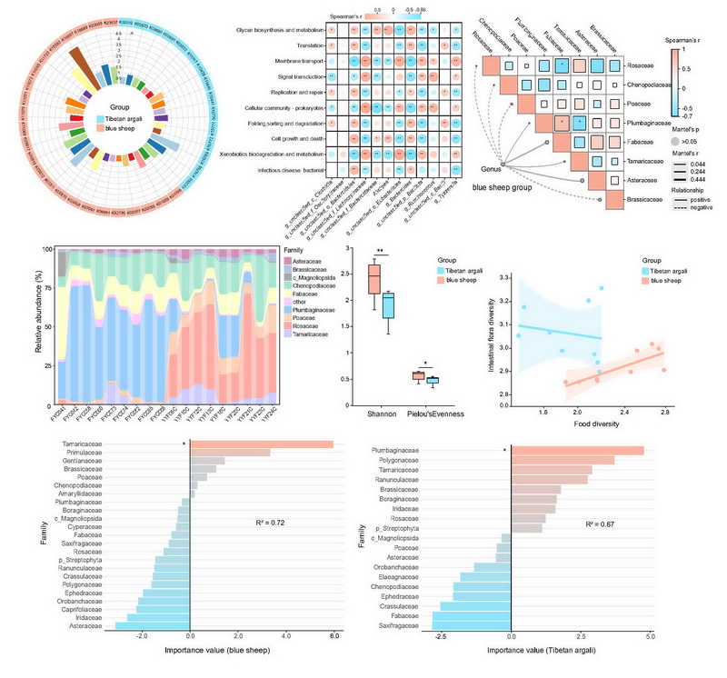 中國科學(xué)院西北高原生物研究所動(dòng)物生態(tài)與資源保護(hù)研究團(tuán)隊(duì)在青海省昆侖山地區(qū)采集了西藏盤羊與巖羊的新鮮糞便樣本,結(jié)合宏基因組測序與植物 trnL片段的高通量測序技術(shù),深入分析了兩者腸道菌群組成、功能特征及食性結(jié)構(gòu)與腸道菌群在生態(tài)適應(yīng)與營養(yǎng)生態(tài)位分化中的潛在作用。研究發(fā)現(xiàn),西藏盤羊與巖羊共棲于高寒生態(tài)環(huán)境中,但其腸道菌群在組成結(jié)構(gòu)與功能特征方面表現(xiàn)出了顯著差異。食性多樣性的高低并不必然反映腸道菌群多樣性的水平,其中西藏盤羊雖食性相對單一,但其腸道菌群多樣性更高,具有更強(qiáng)的代謝適應(yīng)性與纖維降解能力;而巖羊擁有更廣泛的植物攝食譜,卻表現(xiàn)出在糖類代謝相關(guān)功能上更強(qiáng)的腸道菌群代謝適應(yīng)能力。綜合來看,腸道菌群與食性之間的協(xié)同作用可能在推動(dòng)兩物種營養(yǎng)生態(tài)位分化中發(fā)揮重要作用。此外,兩種動(dòng)物在抗生素耐藥基因組成上也存在差異,提示該類指標(biāo)在未來野生動(dòng)物健康評估中具有潛在應(yīng)用價(jià)值。本研究揭示了腸道菌群作為宿主環(huán)境適應(yīng)和生態(tài)位分化的重要調(diào)控因子,其與食性協(xié)同作用推動(dòng)了高原野生動(dòng)物的生態(tài)位分化。研究成果為理解大型食草動(dòng)物腸道菌群與環(huán)境適應(yīng)及生態(tài)位分化提供了全新視角,也為瀕危物種保護(hù)和高原生態(tài)系統(tǒng)可持續(xù)發(fā)展提供了重要參考。