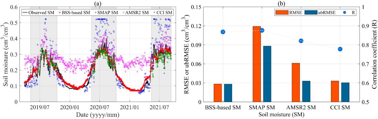 青藏高原典型觀測網(wǎng)絡(luò)實(shí)驗(yàn)表明該方法具有良好的區(qū)域適用性及穩(wěn)定性,顯著降低了對地表粗糙度、植被等信息的依賴,僅利用亮溫時間序列自相關(guān)性約束與少量地面觀測信息,便可實(shí)現(xiàn)對土壤水分的高精度估算。該研究在理論機(jī)制與方法路徑上均實(shí)現(xiàn)了對傳統(tǒng)遙感反演范式的突破,為土壤水分遙感估算提供了一種無需構(gòu)建微波輻射傳輸模型的新思路,同時也為多源信號混合環(huán)境下的其他要素估算提供了創(chuàng)新方案,具有重要的理論意義與應(yīng)用推廣價值。