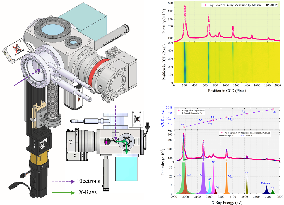 為進(jìn)一步研究這類空心原子的產(chǎn)生與退激特性,科研人員自主研發(fā)了用于多空穴離子X射線精細(xì)結(jié)構(gòu)測(cè)量的緊湊型寬帶高分辨平面晶體譜儀。該譜儀采用了針對(duì)多空穴離子X射線譜特點(diǎn)的獨(dú)特幾何構(gòu)型,通過靶平動(dòng)伴隨晶體同步轉(zhuǎn)動(dòng),大幅提升了譜儀調(diào)節(jié)精準(zhǔn)度和便捷性。此外,該譜儀在緊湊的空間內(nèi)實(shí)現(xiàn)了0.53-19.3 keV的動(dòng)態(tài)范圍及0.04-6.58 keV的單次曝光帶寬,全動(dòng)態(tài)范圍內(nèi)的能譜分辨力好于102,采用馬賽克晶體時(shí)的探測(cè)效率較傳統(tǒng)平面晶體譜儀提高了20倍以上。