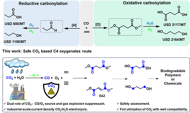 在此前氧化羰基化研究的基礎(chǔ)之上(Science,2024,386: 776-782;Angew Chem Int Ed,2020,59: 2080-2084;ACS Catal.,2023,13: 735-743;ChemSusChem,2022,15: e202102400;分子催化,2020,34,182–192;2024,38,297–308),研究人員通過一種CO2全利用策略,將CO2-H2O共電解生成的CO/O2作為原料,與乙烯/乙炔的氧化雙羰基化合成CO2基C4雙酯類化合物,如丁二酸二甲酯、富馬酸二甲酯和馬來酸二甲酯等,這類化合物在可降解聚合物(聚丁二酸二丁酯)、增塑劑、溶劑、表面活性劑、有機(jī)合成中間體等多個領(lǐng)域內(nèi)有著廣泛的用途。與傳統(tǒng)的烯/炔烴羰基化相比較,烯/炔烴氧化羰基化能同時插入兩個羰基,生成更有價值的化學(xué)品。此外,尚未電解的CO2可作為氣體抑爆劑,可消除或降低乙烯/乙炔氧化雙羰基化反應(yīng)過程中潛在的爆炸風(fēng)險。