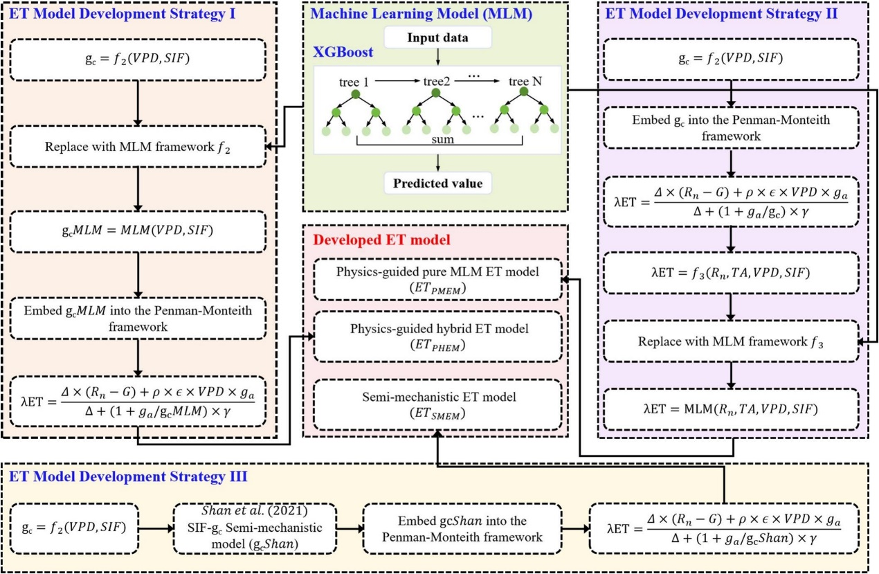 ETPHEM模型利用機(jī)器學(xué)習(xí)框架改進(jìn)冠層氣孔導(dǎo)度-SIF物理模型(gc -SIF模型),再將改進(jìn)的機(jī)制模型鑲嵌至Penman-Monteith模型框架,構(gòu)建ET模型。ETPMEM模型則將gc?-SIF模型物理模型嵌入Penman-Monteith模型框架,再利用機(jī)器學(xué)習(xí)框架改進(jìn)鑲嵌gc?-SIF物理模型后的Penman-Monteith模型,最終形成ET模型。
